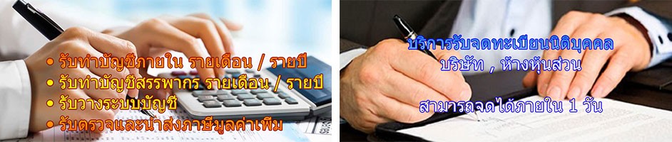 เรายินดีให้บริการงานจดทะเบียนทุกประเภทแก่ท่าน ด้วยทีมงานมืออาชีพที่ดำเนินการจดทะเบียนทุกขั้นตอนอย่างถูกต้องตามวิธีการและหลักเกณฑ์ที่ทางราชการกำหนดไว้ นอกจากนี้ เรายังเสนอบริการจดทะเบียนนิติบุคคลที่จะช่วยให้คุณประหยัดทั้งเวลาและค่าใช้จ่าย ด้วยงานที่มีคุณภาพและเสร็จทันเวลาที่กำหนด โดยมีขั้นตอนที่เป็นระบบ