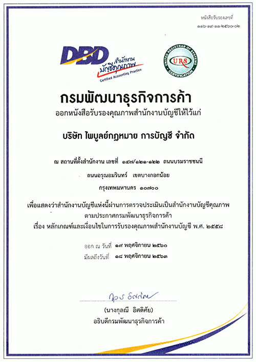 บริษัท ไพบูลย์กฎหมาย การบัญชี  จำกัด เป็นสำนักงานบัญชีคุณภาพที่ผ่านการรับรองคุณภาพสำนักงานบัญชีตามข้อกำหนดการรับรองคุณภาพสำนักงานบัญชี เป็นผู้ประกอบธุรกิจสำนักงานบัญชีมีการปฏิบัติงานที่มีคุณภาพและเป็นที่น่าเชื่อถือ