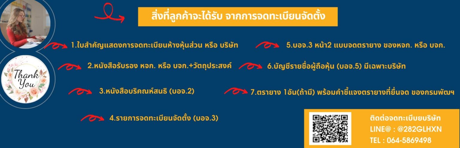 บริการของเรารวมถึงการรับจดทะเบียนจัดตั้งและการแก้ไขเปลี่ยนแปลงบริษัทฯ ห้างหุ้นส่วน ทะเบียนพาณิชย์ และร้านค้า นอกจากนี้ เรายังเป็นตัวแทนในการรับจดจัดตั้งมูลนิธิ ขอใบอนุญาตทำงานสำหรับชาวต่างชาติ ต่อวีซ่า และเวิร์คเพอร์มิต รวมถึงการขอเครื่องหมายการค้าและใบอนุญาตธุรกิจท่องเที่ยว