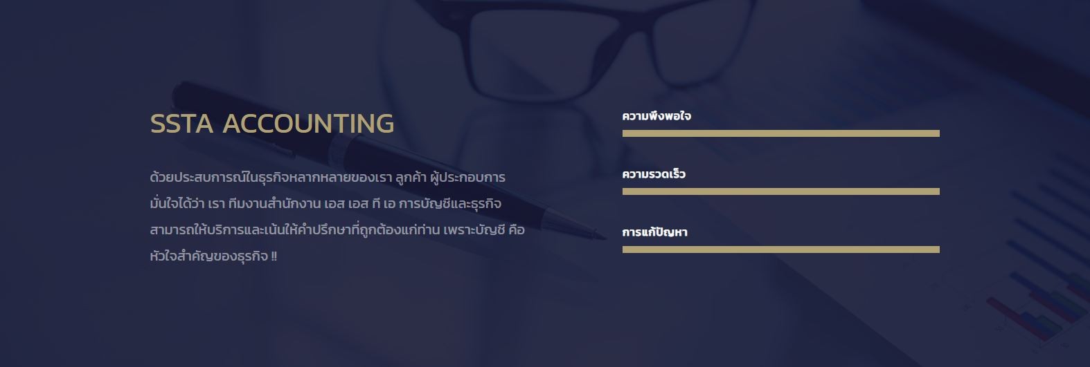 บริษัท เอส เอส ที เอ การบัญชีและธุรกิจ จำกัด ก่อตั้งขึ้นจากการรวมตัวของนักบัญชีที่มีประสบการณ์ครอบคลุมในระบบบัญชีแบบครบวงจรในหลากหลายธุรกิจ โดยทีมงานเริ่มให้บริการจัดทำบัญชีในรูปแบบสำนักงานบัญชีมาตั้งแต่ปี พ.ศ. 2551 และได้ขยายเป็นบริษัทจำกัด เพื่อรองรับการเติบโตของฐานลูกค้าที่ไว้วางใจในบริการของเรา ทีมงานของเราได้รับความไว้วางใจจากเจ้าของธุรกิจมากมายในหลากหลายอุตสาหกรรม นอกเหนือจากการดูแลด้านบัญชี ภาษี และงบการเงิน เรายังได้รับความไว้วางใจให้เป็นที่ปรึกษาและให้บริการด้านอื่น ๆ ที่เกี่ยวข้อง เช่น การวางระบบเอกสาร การวางระบบโปรแกรมบัญชี การตรวจสอบบัญชี การวางแผนภาษี การทำเงินเดือน การจดทะเบียนธุรกิจ การบัญชีนำเข้าส่งออก และให้คำปรึกษาด้านธุรการต่าง ๆ