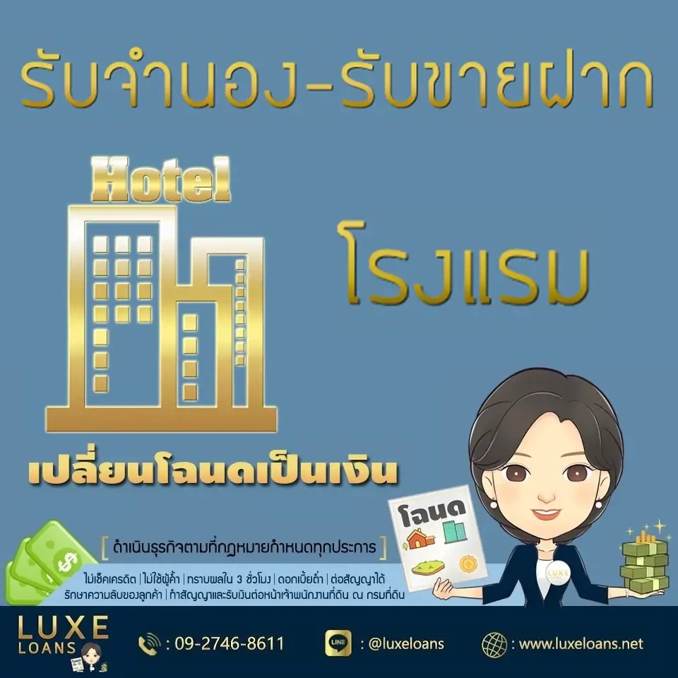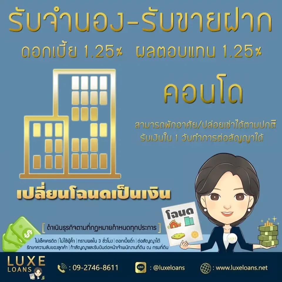 Luxe Loans กลุ่มทุนคนรุ่นใหม่ สภาพคล่องสูง บริการไวด้วยระบบประเมินทรัพย์ที่ทันสมัย และทีมบุคลากรที่มีความเชี่ยวชาญพร้อมทีมงานมีออาชีพ มีนโยบาย ต้องการดอกเบี้ย ไม่ต้องการยึดทรัพย์ ยินดีให้บริการ จำนองคอนโด และขายฝากคอนโด