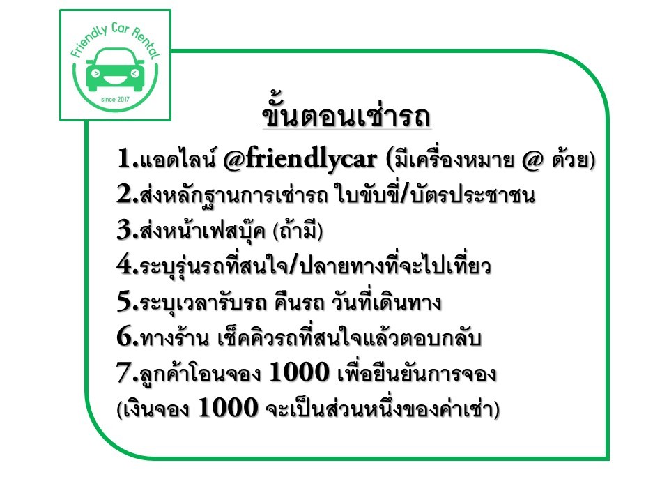 รถเช่ากรุงเทพ Friendly Car Rent เป็นรถให้เช่าในบริเวณ กรุงเทพ และ ปริมณฑล ให้บริการรถเช่า โดยไม่ใช้บัตรเครดิต แก่บุคคลทั่วไป นักศึกษา ผู้ทีมีอาชีพอิสระ เช่ารถง่ายๆ ไม่ยุ่งยาก มัดจำเริ่มต้นเพียง 3,000 บาท มีบริการจัดส่งถึงสนามบิน และที่พัก