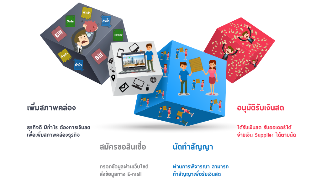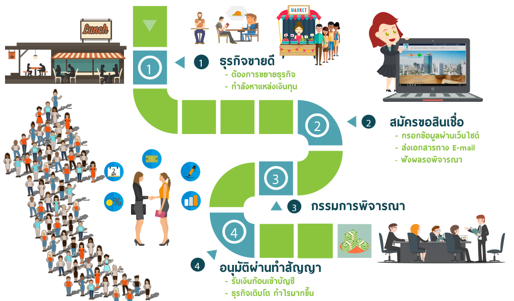 เราสนับสนุนเงินทุน สินเชื่อ ให้ลูกค้าในหลากหลายธุรกิจสามารถสร้างกำไรได้อย่างเต็มกำลังความสามารถ ด้วยความรวดเร็วในการพิจารณาเครดิต มากกว่าการคำนึงเรื่องหลักประกันแบบเดิมๆ ลูกค้าทุกรายจึงไว้วางใจ ให้เราเป็นส่วนหนึ่งในความสำเร็จ