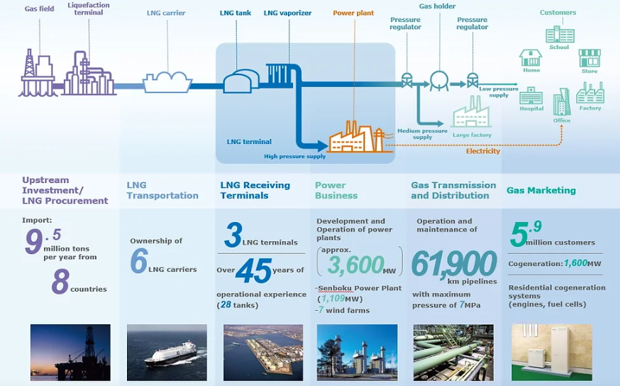 More than 110 years after its establishment, Osaka Gas launched a new brand called "Daigas Group" in March 2018. As an energy marketer of a new era, the Daigas Group combines a variety of services, including gas and electricity, to deliver optimal solutions to customers. We are expanding our business fields through upstream development projects, LNG base development, IPP projects, and fuel retailing In South East Asia.