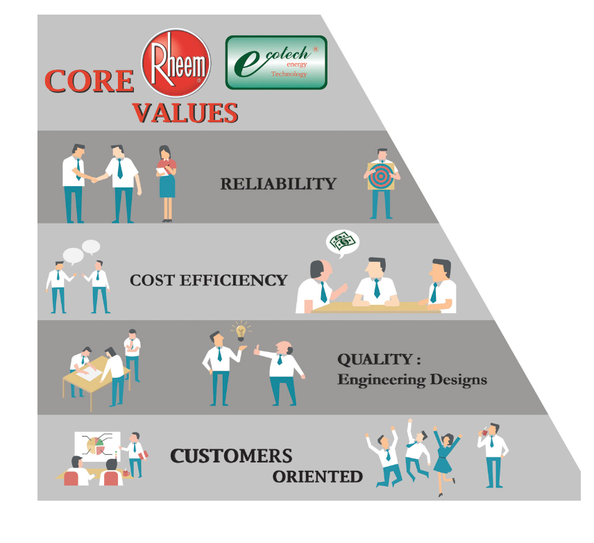 บริษัท ตั้งปณิธานว่า จะเป็นส่วนหนึ่งของสังคมที่จะดำเนินธุรกิจด้วยความโปร่งใส, เชื่อถือได้, และพร้อมให้คำแนะนำแก้ไขปัญหาระบบน้ำร้อน แบบมืออาชีพ โดยคำนึงถึง ประโยชน์สูงสุดของลูกค้า, คู่ค้า, ผู้ถือหุ้น ประเทศไทยกับสิ่งแวดล้อม เป็นหลัก