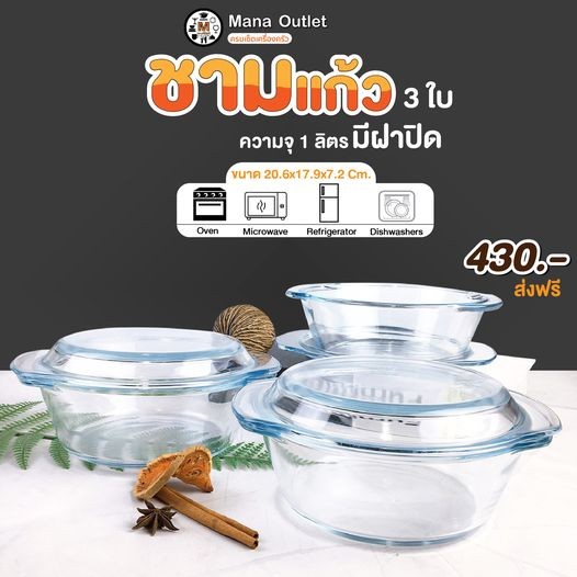 • Mana ชามแก้วพร้อมฝา 3ใบ
