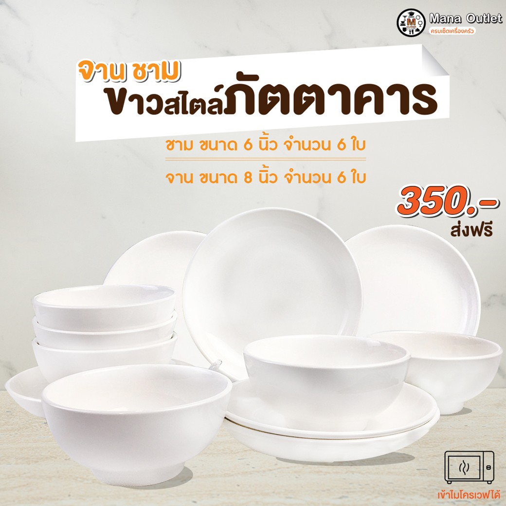 • จานชามขาวสไตล์ภัตตาคาร 12 ชิ้น