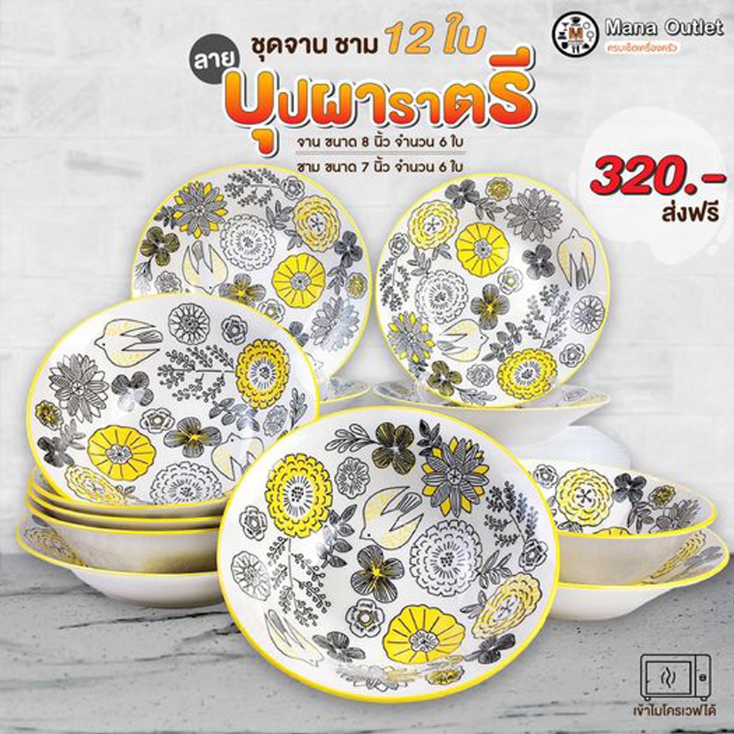 • Mana จานลายบุปผาราตรี 12 ชิ้น ขนาด 8 นิ้ว