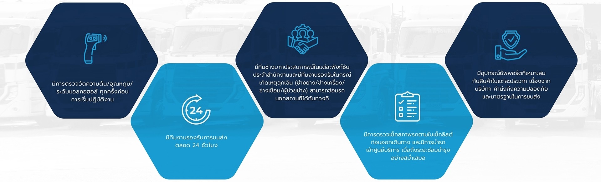 ให้บริการงานขนส่งสินค้าทุกประเภท โดยใช้รถขนส่งที่มีประสิทธิภาพสูง มีรถหัวลากบริการมากกว่า 70 คัน รวมถึงหางรถชนิดต่าง ๆ มากกว่า 180 หาง ไม่ว่าจะเป็นหางพื้นเรียบทั้ง 2 และ 3 เพลา หางโรเบท หางขนาดพิเศษ