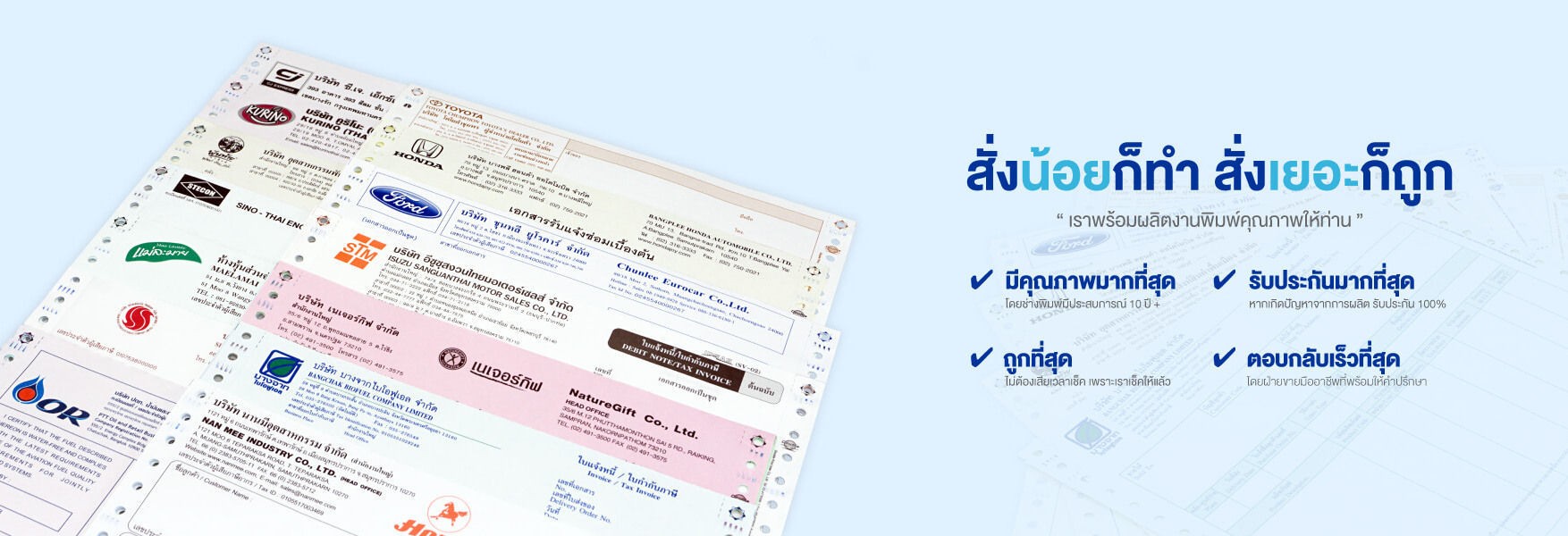 ประสบการณ์ในการทำธุกิจสิ่งพิมพ์คอมพิวเตอร์ฟอร์มเป็นเวลาหลายปี เราเป็นหนึ่งในธุรกิจที่เข้าใจการผลิตอย่างแท้จริง เป็นโรงงานที่ได้ยอมรับการเชื่อถือ จากกลุ่มบริษัทชั้นนำของประเทศ ที่ไว้วางใจในแบรนด์ มากกว่า 3,000 บริษัท และเราผลิตสินค้าที่มีคุณภาพ ราคายุติธรรม