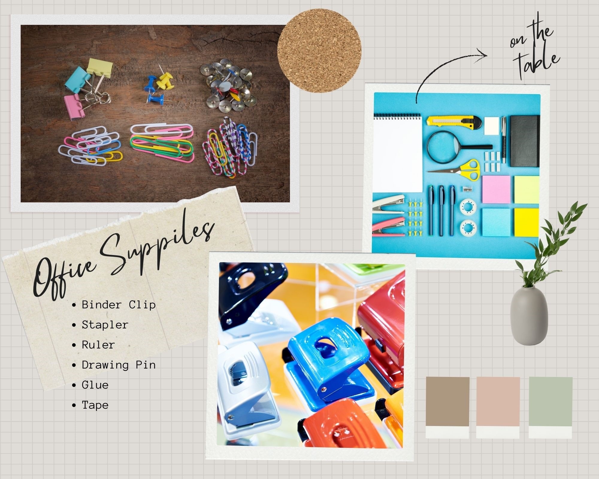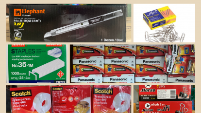 อุปกรณ์สำนักงาน เช่น แฟ้มเอกสาร ซองเอกสาร อินเด็กซ์ หมึกพิมพ์คอมพิวเตอร์ เทป เครื่องเขียน เช่น ปากกาลูกลื่น/เจล ดินสอ ยางลบ น้ำยาลบคำผิด ผลิตภัณฑ์กระดาษ เช่น กระดาษถ่ายเอกสาร 80 G กระดาษทำปก 150 G กระดาษต่อเนื่อง