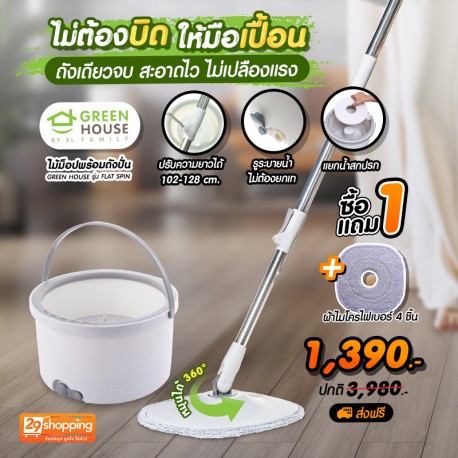 • Green House ไม้ม็อป พร้อมถังปั่น รุ่น Flat Spin ซื้อ 1 แถม 1 พร้อมผ้าไมโครไฟเบอร์ 4 ผืน