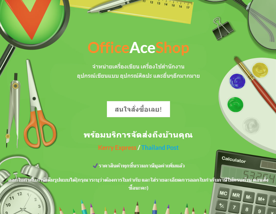 เราจำหน่ายเครื่องเขียน เครื่องใช้สำนักงาน อุปกรณ์เขียนแบบ อุปกรณ์ศิลปะ และอื่นๆอีกมากมาย มีสินค้าให้เลือกช้อปมากกว่า 5,000 รายการ พร้อมรองรับทุกความต้องการ อาทิ เช่น อุปกรณ์คอมพิวเตอร์และไอที, เฟอร์นิเจอร์, อุปกรณ์สำนักงาน, งานปริ้น และ สินค้าพรีเมียม สินค้าอื่นๆอีกมามาย, ช้อปออนไลน์ที่ officeaceshop.com มั่นใจในคุณภาพ ด้วยการคัดสรรสินค้าคุณภาพหลากหลายแบรนด์ officeaceshop.com มุ่งมั่นที่จะพัฒนาประสบการณ์การช้อปปิ้งออนไลน์ที่ดีที่สุดให้กับคุณอย่างไม่หยุดยั้ง
