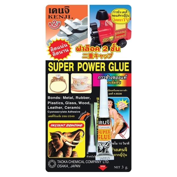 คุณสมบัติ: กาวตราช้างเคนจิ ใช้ซ่อมติดผิววัสดุ เช่น โลหะ พลาสติก ยาง เครื่องหนัง กระเบื้องเคลือบ งานไม้ เฟอร์นิเจอร์ เครื่องแก้ว ของเล่นเด็ก อุปกรณ์อิเลคโทรนิคส์ อุปกรณ์ตกแต่งรถยนต์ และเครื่องประดับ (ยกเว้นการใช้งานกับวัสดุ เช่น โพลีอีทีลีน โพลีโพรพีลีน เทปล่อน และยางซิลิโคน)
