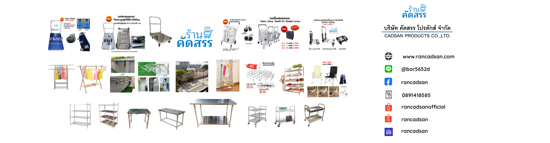 “ร้านคัดสรร” rancadsan ปลีก-ส่ง ราวตากผ้า, ราวตากผ้าติดผนัง, ราวตากผ้าคอนโด, ราวสนาม, รถเข็นของ, รถเข็นจ่ายตลาด รถเข็นตะกร้า4ล้อพับเก็บได้, โต๊ะสแตนเลส, ชั้นวางของสแตนเลส, รถเข็นมีล้อ, ชั้นวางเครื่องดื่ม, รถเข็นเก็บจาน, ที่คว่ำจาน, ชั้นวางรองเท้า, ไม้แขวนเสื้อ, ไม้แขวนพวงหนีบ, เก้าอี้สนาม, เก้าอี้พับแค้มปิ้ง,โต๊ะพับ และอีกกว่า 100รายการ ประสบการณ์กว่า 10 ปี