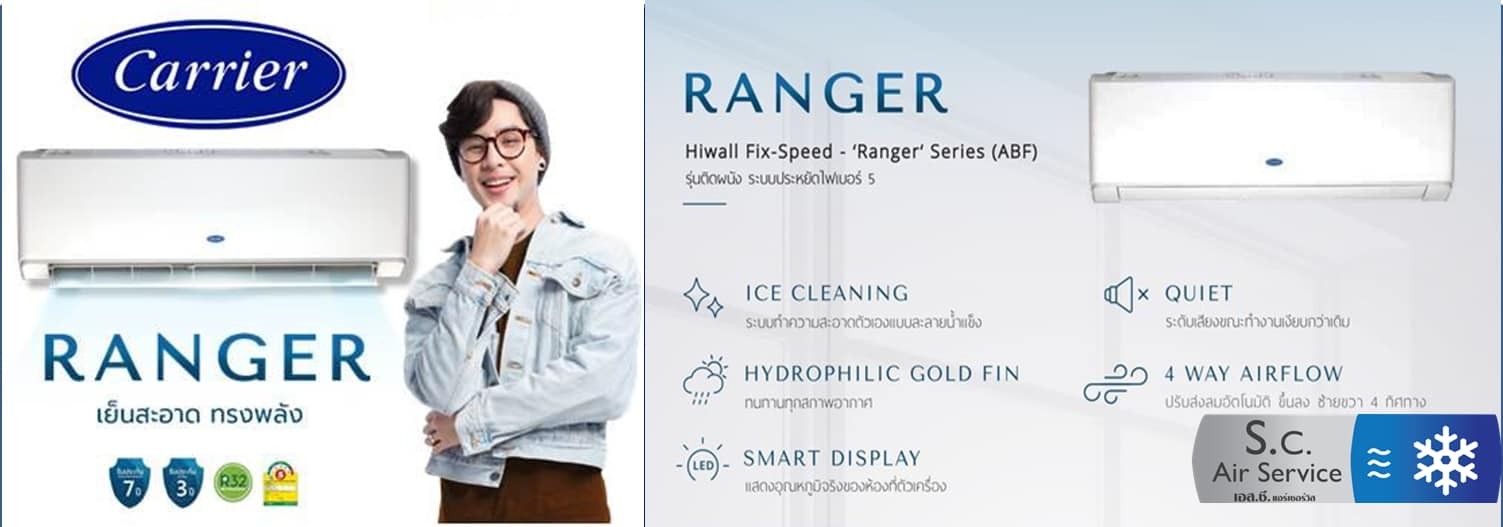 • แอร์ แคเรีย รุ่น ranger ระบบธรรมดา น้ำยา R32 ประหยัดไฟเบอร์ 5 รับประกันคอมเพรสเซอร์ 7 ปี อะไหล่ 3 ปี