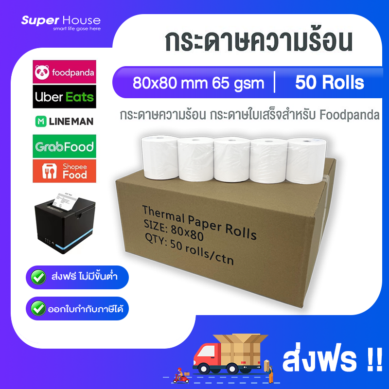 • [จัดส่งฟรี] กระดาษความร้อน กระดาษใบเสร็จ 80x80mm 65gsm 1กล่อง 50 ม้วน