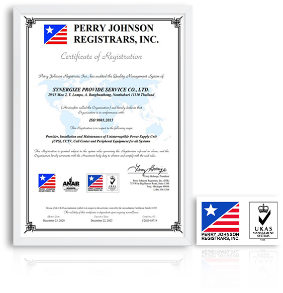 ด้วยศักยภาพและความมุ่งมั่นที่ปรับปรุงบริการตลอดจนระบบการจัดการองค์กรอย่างต่อเนื่องส่งผลให้ Synergize Provide Service Co., Ltd. ได้รับการรับรองการควบคุมคุณภาพ ISO 9001 : 2015 ซึ่งครอบคลุมในด้านต่างๆคือ : Provider, Installation and Maintenance of Uninterruptible Power Supply Unit (UPS), CCTV, Call Center และอุปกรณ์ต่อพ่วงทุกระบบ