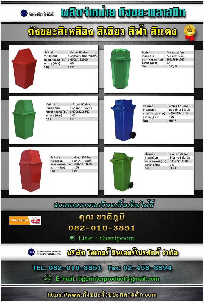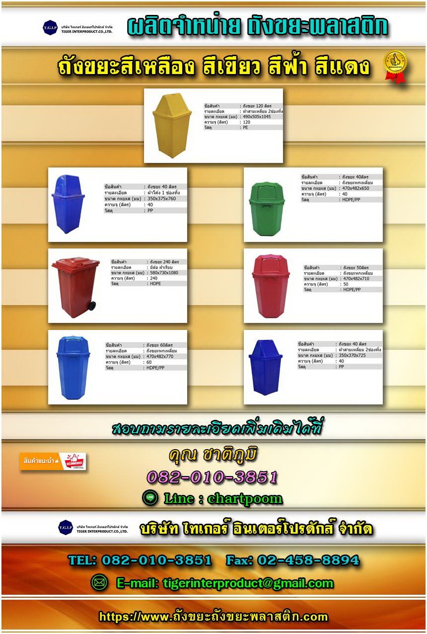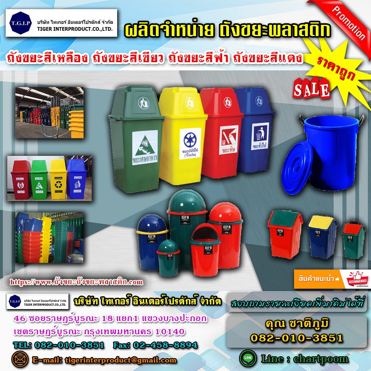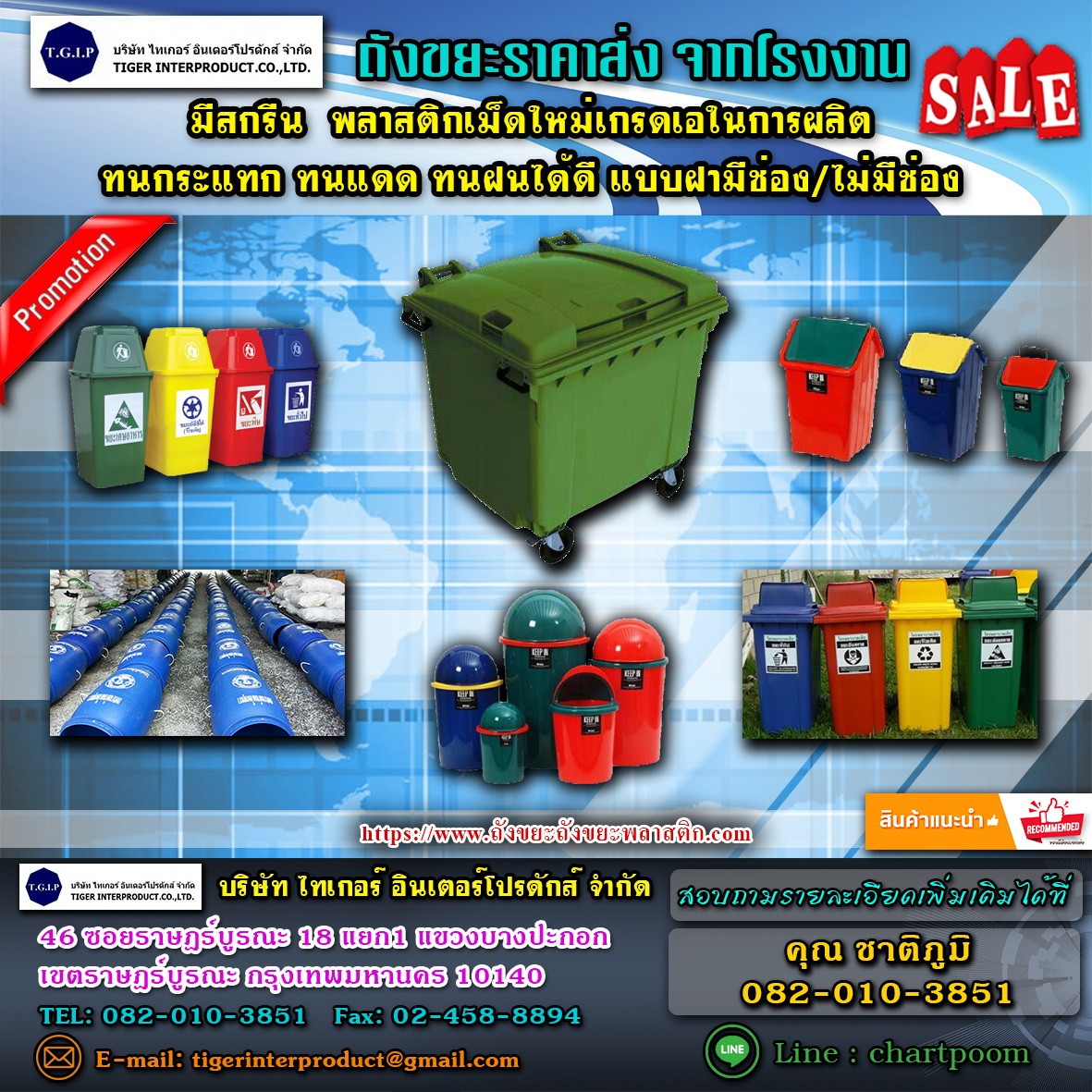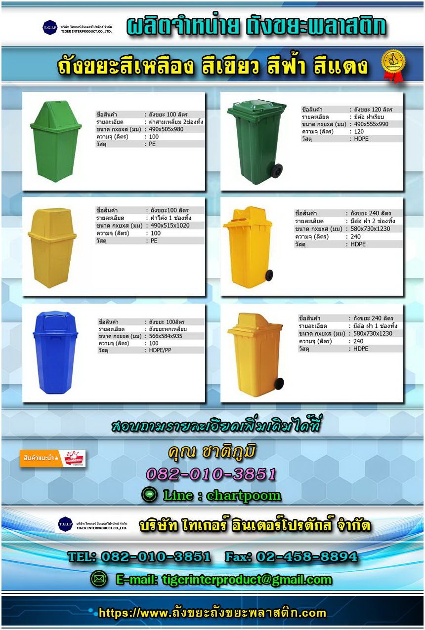 จำหน่าย ถังขยะขนาดต่างๆ 240 ลิตร, 120 ลิตร, 100 ลิตร ใช้พลาสติกเม็ดใหม่ เกรดเอ ในการผลิต ทนต่อแรงกระแทก ทนแดด ทนฝนได้ดี แบบฝามีช่อง/ไม่มีช่อง รองรับขยะมูลฝอยตามสีต่าง ๆ มี 4 สี ถังขยะสีเหลืองสำหรับขยะแห้ง ถังขยะสีเขียวสำหรับขยะเปียก ถังขยะสีฟ้าสำหรับขยะรีไซเคิล ถังขยะสีแดงสำหรับขยะอันตราย