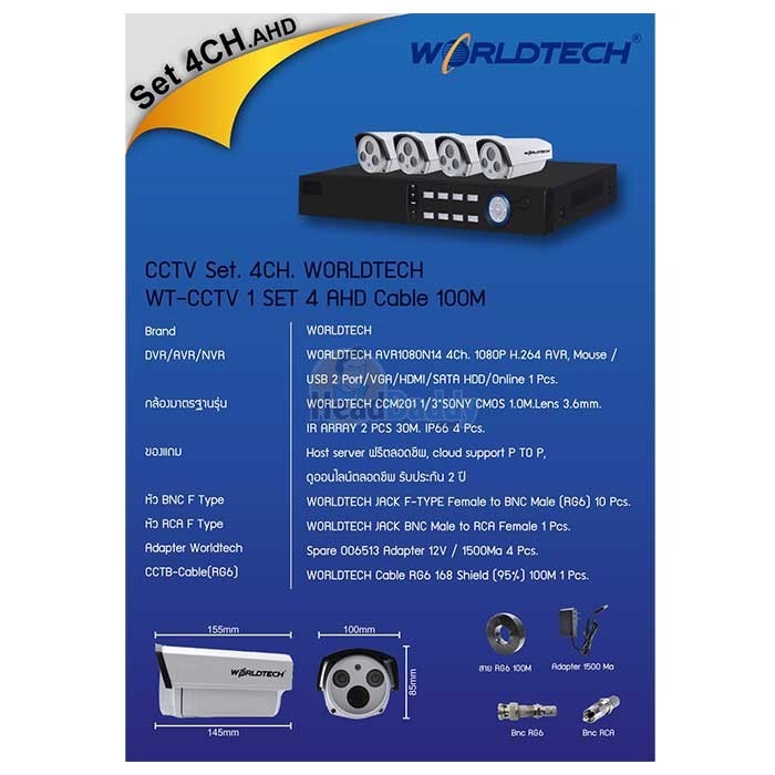 • CCTV Set. 4CH. AHD WORLDTECH#1080N14/CCM201AHD (Cable 100M)