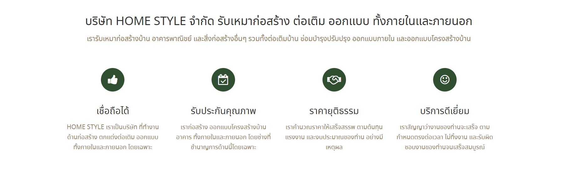 “บริษัท HOME STYLE จำกัด” ดำเนินธุรกิจด้านงานรับเหมาก่อสร้าง ออกแบบภายในและภายนอก โดยลักษณะงานที่ดำเนินการอยู่ ในปัจจุบัน ได้แก่ งานสิ่งก่อสร้าง บ้าน อาคารพาณิชย์ อาคารสำนักงาน งาน Renovation สิ่งก่อสร้างต่างๆ รวมไปถึงงานต่อเติมทุกประเภท ด้วยประสบการณ์กว่า 30 ปี เรามีความชำนาญในสิ่งก่อสร้างประเภทต่างๆ พร้อมให้คำแนะนำความรู้กับลูกค้าเป็นอย่างดี เรามีความตั้งใจสรรค์สร้างผลงานที่มีคุณภาพ ตรงต่อเวลา ในราคาที่ยุติธรรมที่สุ เรารับผิดชอบ และใส่ใจผลงานทุกขั้นตอน รวมถึงลูกค้าทุกท่าน จนเราได้รับการยอมรับจากลูกค้าตลอดมา