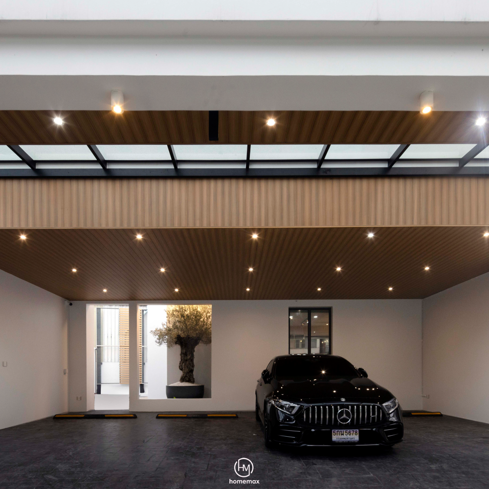 จุดเด่นของที่จอดรถคือสามารถจอดรถยาวได้ถึง 10 เมตรโดยไม่มีเสาเพราะอยากให้พื้นที่ส่วนนี้โล่ง ไม่มีอะไรมาบดบัง สายตาเมื่อเวลาเปิดประตูที่จอดรถ ทำให้ดูโอ่โถง ทันสมัย และสะดวกต่อการใช้งานเมื่อนำรถเข้าจอดไม่ต้องระวังเสา ทำให้ทีมวิศวกรต้องทำทำงานกันอย่างหนักเพื่อคำนวณการรับน้ำหนัก โดยใช้เทคนิค Wide Span ซึ่งผลลัธ์ที่ได้ก็ออกมาดีมาก ภายในตัวบ้านก็ได้ใช้เทคนิคการทำ Wide Span เช่นกัน เพื่อให้พื้นที่ดูเชื่อมต่อและต่อเนื่องกับการใช้งาน ทางสถาปนิกไม่เพียงแต่ คำนึงความสวยของบ้านเท่านั้น ยังคำนึงถึงการใช้สอยภายใน