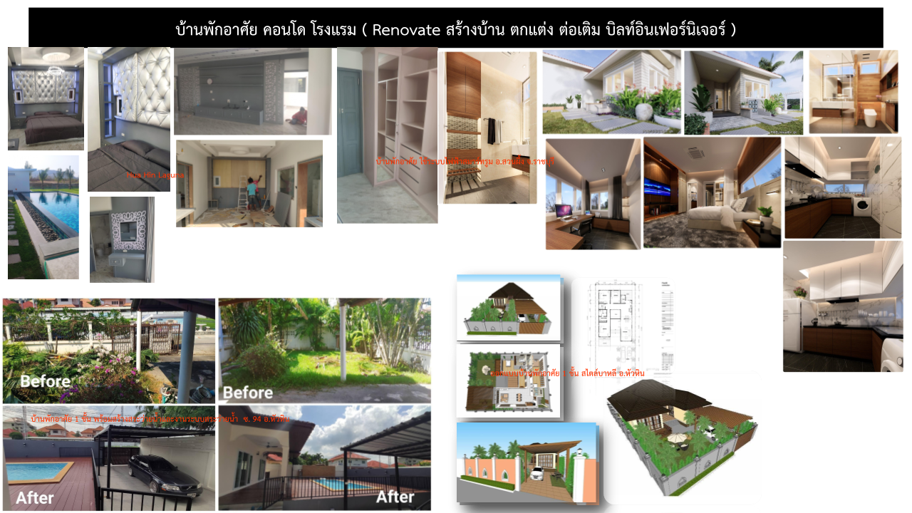 เราดำเนินธุรกิจรับเหมาก่อสร้าง ออกแบบ บิลท์อิน ตกแต่งภายใน บ้าน สำนักงาน หอพัก รีสอร์ท คอนโด รับเหมางานสี รับเหมางานก่อสร้างทั่วไป สระว่ายน้ำ สวยถูกใจ ในราคาเบา ๆ ที่งบไม่บาน