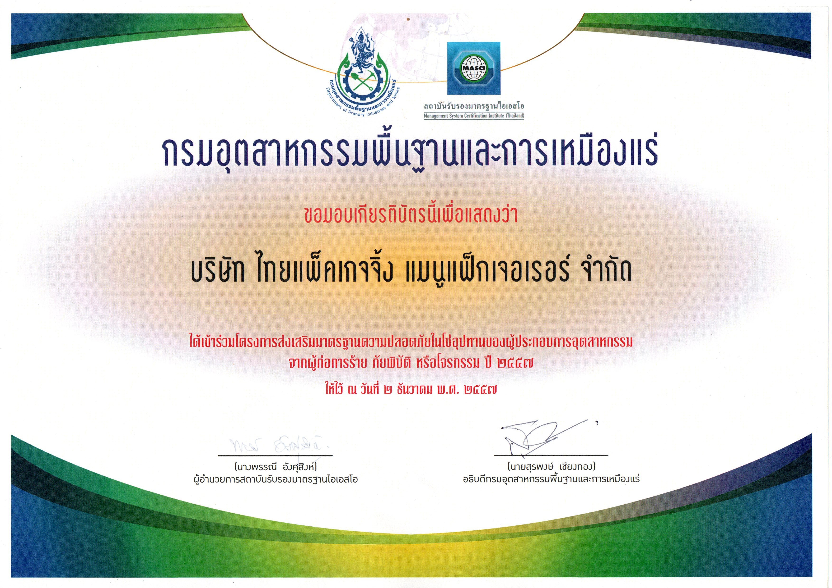 • ปี พ.ศ. 2557 บริษัทได้รับการยอมรับในมาตรฐาน Green Industry ระดับ 2 จากกรมส่งเสริมอุตสาหกรรม กระทรวงอุตสาหกรรม Cert. No.2-2263/2557.