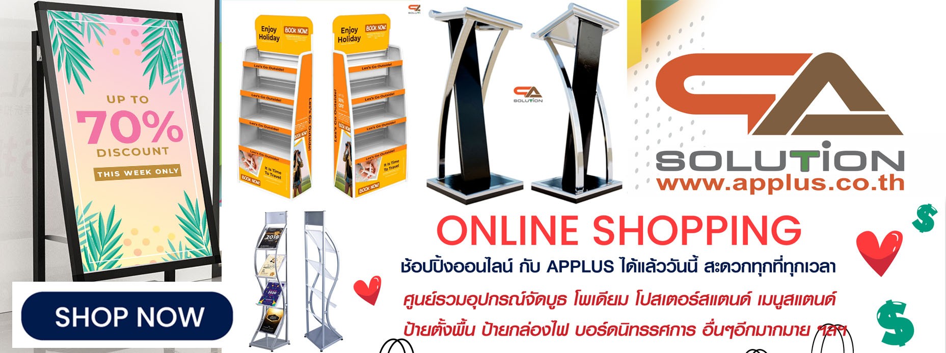 บริษัท เอพีพลัส โซลูชั่น จำกัด  ศูนย์จำหน่ายอุปกรณ์จัดบูธ ดีสเพลย์ ครบวงจร  โพเดียม โปสเตอร์สแตน เมนูสแตนด์ เมนูตั้งโต๊ะ เกมส์อีเว้นท์ ชั้นวางสินค้า ซุ้มเฉลิมพระเกียรติฯ บอร์ดนิทรรศการ ชั้นวางโบชัวร์ ตู้ไฟสำเร็จรูป SNAP FRAME ป้ายทรูป สแตนดี้ งานอะคริลิคขึ้นรูปบริการพิมพ์ป้ายไวนิล สติ๊กเกอร์ ซีทรู ฯลฯ ราคาโรงงาน พร้อมติดตั้งสินค้าคุณภาพ ราคาโรงงาน พร้อมจัดส่งทั่วไทย