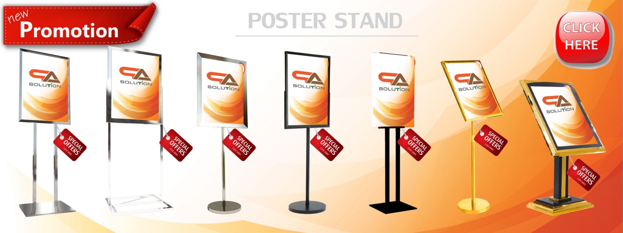 Poster Stand หรือ โปสเตอร์สแตนด์ หรือ ขาตั้งโปสเตอร์ คือ อุปกรณ์สำหรับติดป้ายประกาศ หรือโฆษณาประชาสัมพันธ์ เมนูอาหาร โปรโมชั่นต่างๆ โดยทั่วไปผลิตจากโลหะ ซึ่งใช้วัสดุที่แข็งแรง ทนทาน เช่น เหล็ก สแตนเลส อะลูมิเนียม หรือ อะคริลิค เป็นต้น รวมถึงสามารถเปลี่ยนภาพได้ง่าย จึงมีหลากหลายรูปแบบ ทั้งแบบขาตั้งโปสเตอร์ที่สามารถปรับระดับได้ แบบโชว์ภาพได้ทั้ง 2 ด้านโดยใช้แผ่นอะคริลิคใสประกบ 2 แผ่น ฐานเหลี่ยม ฐานกลม 2 ชั้น ส่วนขนาดมีตั้งแต่ขนาด A4, A3, A2, A1, A0 หรือสั่งผลิตตามขนาดที่ต้องการ บริษัท เอพีพลัส โซลูชั่น จำกัด ศูนย์จำหน่าย Poster Stand (โปสเตอร์สแตนด์) ขาตั้งโปสเตอร์ปรับระดับได้ ป้ายประชาสัมพันธ์ตั้งพื้น ผลิตจากวัสดุคุณภาพเกรดเอ ในราคาโรงงาน จัดส่งทั่วประเทศ สินค้ามีหลากหลายแบบ หลายสไตล์ เช่น แบบปรับระดับได้ ฐานกลม ฐานเหลี่ยม เสาคู่ สแตนเลส เหล็กพ่นสี อะลูมิเนียม ฯลฯ