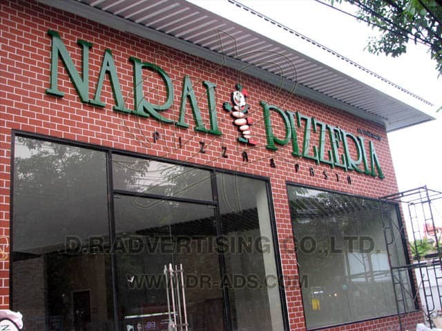 ป้ายตัวอักษร สำหรับการไปติดไว้ในตำแหน่งส่วนใดส่วนหนึ่งของอาคารเพื่อบ่งชี้ถึงชื่อบริษัท คำโฆษณา ถึงสถานที่นั้นๆ การเลือกตำแหน่งติดตั้งนั้นขึ้นอยู่กับสถานที่และความเหมาะสม รวมถึงสามารถมองเห็นและอ่านได้ชัดเจน