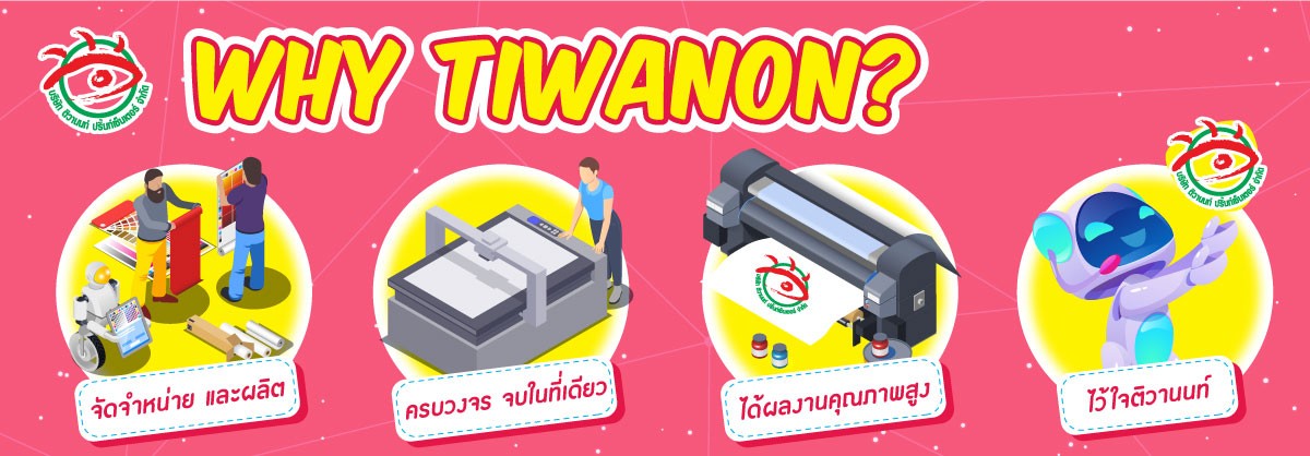 บริษัท ติวานนท์ปริ้นท์ เซ็นเตอร์ จำกัด หรือ Tiwanonprint Center ให้ความสำคัญกับบริการที่รวดเร็ว ถูกต้อง แม่นยำ และตรงต่อเวลาตามสัญญา เพื่อสร้างความไว้วางใจให้กับลูกค้าและสนับสนุนให้งานของลูกค้าสามารถดำเนินการได้อย่างต่อเนื่อง นอกจากนี้ เรายังพร้อมให้คำปรึกษาและบริการที่หลากหลายภายใต้นิยามคำว่า "คิดงานด้วยสมอง ทำงานด้วยหัวใจ" ในโลกธุรกิจที่มีการแข่งขันสูง ความโดดเด่นของป้ายสินค้าถือเป็นเสมือนบุคลิกของกิจการ การเลือกสรรผู้เชี่ยวชาญที่สามารถนำเสนอความเป็นตัวตนของกิจการจึงเป็นการตอบสนองความโดดเด่นทางธุรกิจ และเป็นสิ่งที่บอกถึงความเป็นตัวตนขององค์กรนั้น ๆ