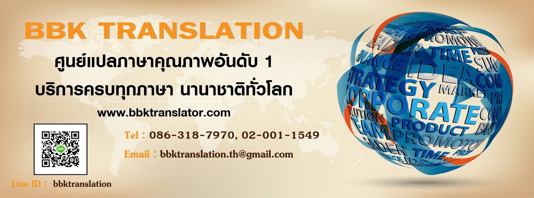รับแปลเอกสาร รับแปลภาษาด่วน รับแปลภาษาไทยเป็นอังกฤษ หรือแปลภาษาอังกฤษแปลเป็นไทย และภาษาอื่นๆอีกมากมาย อาทิภาษา ญี่ปุ่น จีน เกาหลี อังกฤษ พม่า เวียดนาม อาหรับ รัสเซีย เยอรมัน ฝรั่งเศส สเปน และภาษาอื่นๆ อีกมากมาย ศูนย์การแปลเอกสาร บีบีเคทรานสเลชั่น เราบริการแปลภาษาที่ได้คุณภาพ ระดับมืออาชีพ พร้อมด้วยทีมงานคุณภาพ ทั้งนักแปลผู้ทรงคุณวุฒิชาวไทยและชาวต่างประเทศเจ้าของภาษาโดยแต่ละนักแปลและล่ามแต่ละท่านล้วนมีความเชี่ยวชาญทางด้านการแปลเฉพาะด้าน ประสบการณ์แปลภาษาสูง ราคาที่ยุติธรรมและสามารถจ่ายได้ พร้อมด้วยงานคุณภาพ เนื้อหาถูกต้องครบถ้วนตามต้นฉบับ