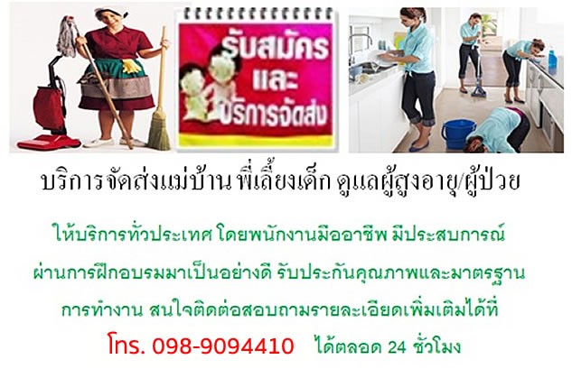ยินดีให้บริการจัดส่งแม่บ้าน ให้บริการแม่บ้าน บริการแม่บ้านอยู่ประจำ บริการจัดส่งแม่บ้านไป-กลับ แม่บ้านสำนักงาน แม่บ้านออฟฟิต จัดหาพนักงานดูแลคนชรา ดูแลผู้ป่วย พนักงานเฝ้าไข้ตามรพ. ผู้ช่วยพยาบาล ทั้งอยู่ประจำและไป-กลับ จัดส่งพี่เลี้ยงเด็กอยู่ประจำ จัดส่งพี่เลี้ยงเด็กพี่เลี้ยงเด็กไป-กลับ จัดส่งพี่เลี้ยงเด็กพี่เลี้ยงเด็กแรกคลอด จัดส่งพี่เลี้ยงเด็กพี่เลี้ยงเด็กอ่อน จัดส่งพี่เลี้ยงเด็กพี่เลี้ยงเด็กโต จัดส่งแม่ครัวประจำบ้าน จัดส่งแม่ครัวร้านอาหาร จัดส่งกุ๊กประจำร้านอาหาร ให้บริการพนักงานขับรถ พนักงานขับรถบ้าน พนักงานขับรถผู้บริหาร ขับรถรับ-ส่ง น้องไปโรงเรียน จัดส่งทั่วประเทศ
