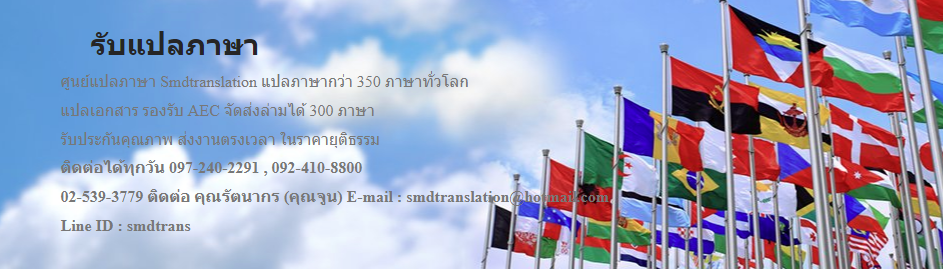 SMDTranslation ศูนย์แปลภาษานานาชาติชั้นนำของประเทศ เราพร้อมให้บริการแปลเอกสารภาษาอังกฤษ จีน เกาหลี ญี่ปุ่น รัสเซีย เยอรมัน และภาษาอื่นๆ เรามีความเชี่ยวชาญด้านภาษา ประสบการณ์มากว่า 10 ปีและมีความมุ่งมั่นเต็มเปี่ยม พร้อมทีมงานนักแปลเจ้าของภาษาทรงคุณวุฒิ ที่พร้อมดูแลงานของท่านได้เป็นอย่างดี และส่งงานตรงเวลา เราเป็นบริษัทแปลเอกสาร ทีมงานใส่ใจสูงสุดต่อความต้องการของลูกค้า และพร้อมให้คำปรึกษาทุกเมื่อ เราถือคติที่ว่า ''การบริการที่ดีมาพร้อมกับคุณภาพงานที่เยี่ยมยอด'' เราพร้อมให้บริการท่านตลอด 24 ชั่วโมง ศูนย์แปลภาษา แปลเอกสาร SMDTranslaion เป็นสำนักงานขนาดใหญ่ กว้างขวาง สะดวกสบาย มีเจ้าหน้าที่พร้อมให้การรับรองลูกค้าที่เข้ามาติดต่อทุกท่าน และมีบริการประเมินและรับส่งเอกสารทาง Fax หรือ Email สำหรับลูกค้าที่ไม่สะดวกเดินทางเข้ามาด้วยตนเอง