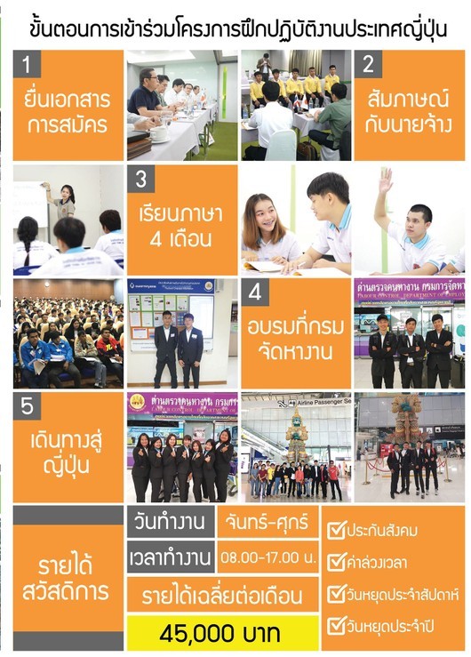 การฝึกปฏิบัติงานที่ประเทศญี่ปุ่น จะมีทั้งแบบ 1 ปี และ 3 ปี หลังจากนั้นสามารถต่อได้ถึง 5 ปี ขึ้นอยู่กับนายจ้าง โดยรายได้ที่จะได้รับนั้นจะตรงตามรายได้ขั้นต่ำตามแต่ละจังหวัดของประเทศญี่ปุ่น ผู้ที่จะไปฝึกปฏิบัติงานนั้นจะต้องมีคุณสมบัติตรงตามที่นายจ้างกำหนด และเข้าสอบสัมภาษณ์กับนายจ้างโดยตรง จะมีล่ามของบริษัทจัดหางาน อุบลไทยเวลเดอร์ จำกัด คอยให้บริการช่วยเหลือตลอดเวลาที่สัมภาษณ์ หากสอบสัมภาษณ์ผ่าน ทางบริษัทและนายจ้างจะอธิบายรายละเอียดเรื่องรายได้ของงาน รวมถึงสวัสดิการต่างๆ ให้รับทราบ หากผู้ฝึกปฏิบัติงานเห็นชอบ ก็เข้าสู่กระบวนการเรียนภาษาญี่ปุ่นสำหรับเตรียมความพร้อมก่อนเดินทางเบื้องต้น การอบรมเรียนภาษาญี่ปุ่นเบื้องต้นจะใช้ระยะเวลาเรียนประมาณ 4 เดือน และก่อนบินก็จะมีการอบรมกับทางกรมแรงงาน เพื่อให้ทราบเรื่องการฝึกปฏิบัติงานที่ต่างประเทศ เมื่อถึงประเทศญี่ปุ่นแล้วก็จะมีการอบรมภาษาญี่ปุ่นอีก 1 เดือนก่อนที่จะได้เข้าไปปฏิบัติงานจริงกับบริษันายจ้าง