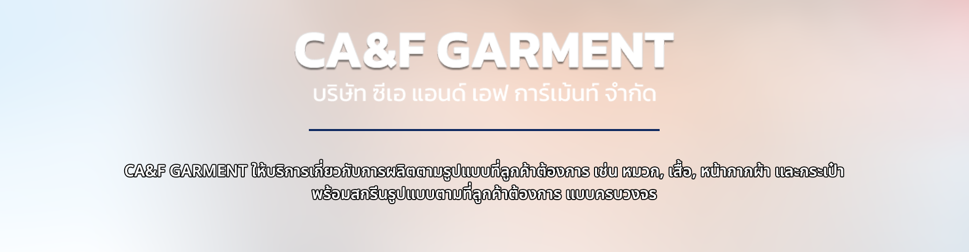 CA&F GARMENT ให้บริการเกี่ยวกับการผลิตตามรูปแบบที่ลูกค้าต้องการ เช่น หมวก ,เสื้อ ,หน้ากากผ้า และกระเป๋า พร้อมสกรีนรูปแบบตามที่ลูกค้าต้องการ แบบครบวงจร เราใส่ใจทุกขั้นตอนการผลิต ให้ออกมาได้มาตรฐาน ผลิตด้วยเนื้อผ้าเกรดพรีเมี่ยม พร้อมแบบให้เลือกมากกว่า 100+ รูปแบบ และยังสามารถออกแบบตามที่ลูกค้ากำหนดพิเศษได้อีกด้วย มั่นใจในงานผลิต ตรวจงานทุกขั้นตอน QC งาน 100% งานรวดเร็ว จัดส่งตรงตามเวลา ราคามิตรภาพ ติดต่อฝ่ายขายเราได้ที่ caf-garment.com