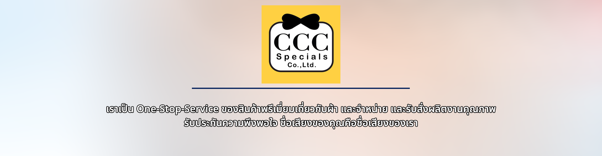 เราเป็น One-Stop-Service ของสินค้าพรีเมี่ยมเกี่ยวกับผ้า และจำหน่ายและรับสั่งผลิตงานคุณภาพ รับประกันความพึงพอใจ ชื่อเสียงของคุณคือชื่อเสียงของเรา