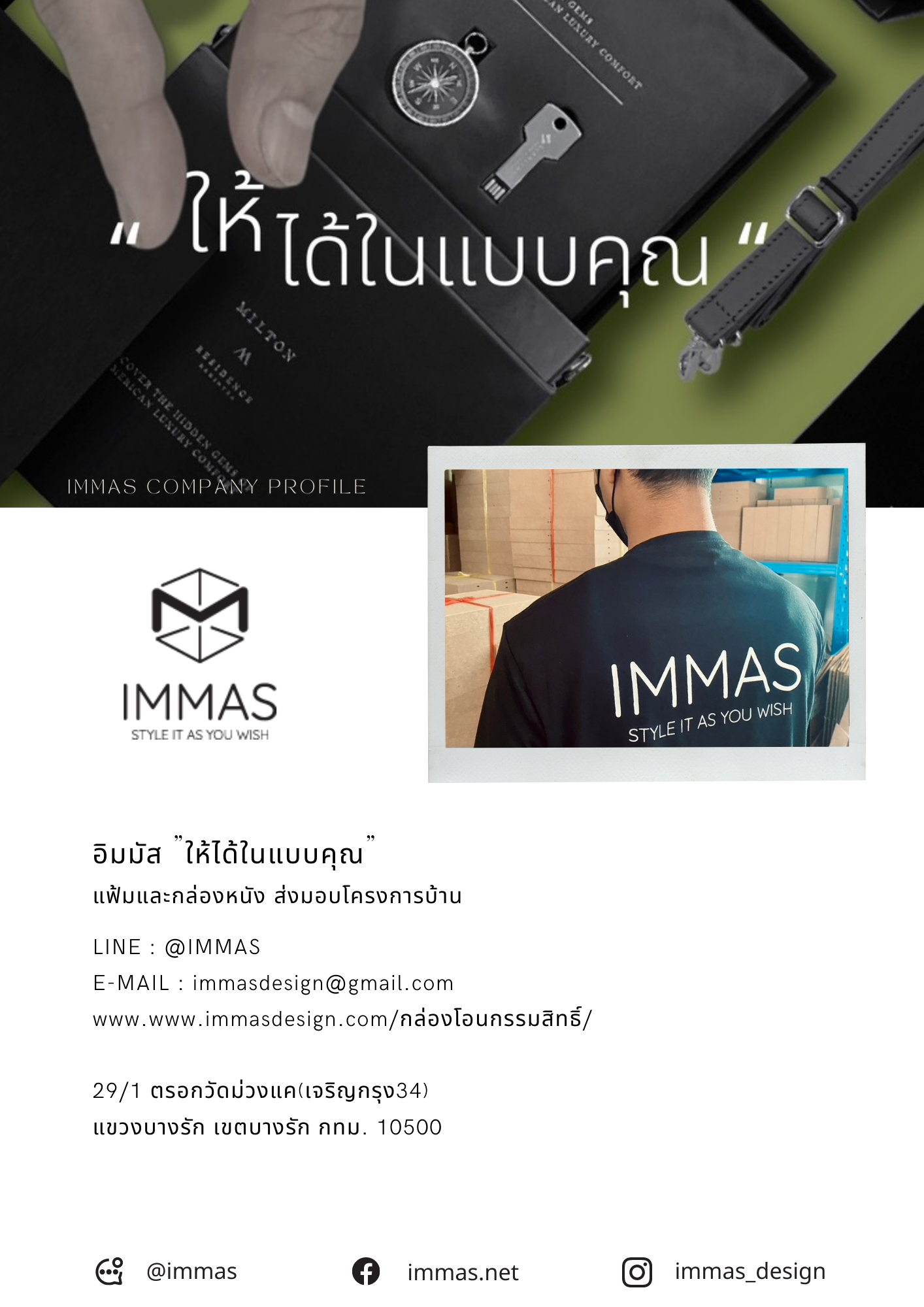 อิมมัส ดีไซน์ (Immas Deisgn) เราออกแบบ และผลิตงานหัตถกรรมร่วมสมัยที่แสดงถึงคุณค่าจากผ้าไหมไทยให้คงเอกลักษณ์อันงดงามคิดสร้างสรรค์ของขวัญพรีเมี่ยมใช้หลักการออกแบบผลิตภัณฑ์ บรรจุภัณฑ์ และกราฟฟิคให้ผลิตภัณฑ์มีเอกลักษณ์น่าจดจำ เกิดความประทับใจแก่ผู้ได้รับ
