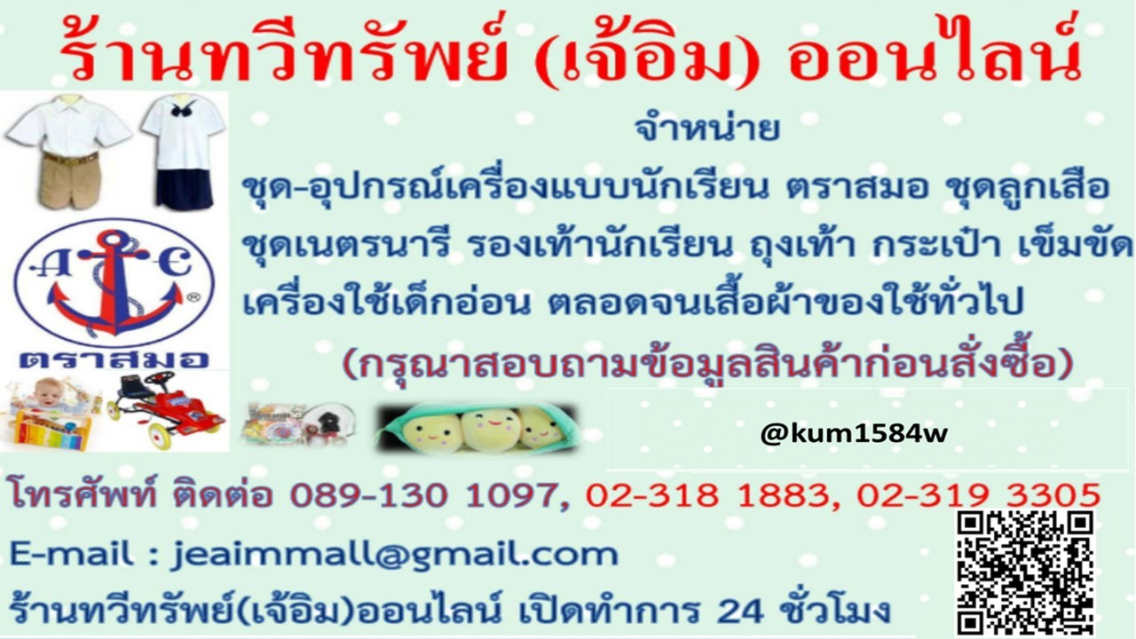 สวัสดีค่ะ เจ้อิม ยินดีต้อนรับลูกค้าทางออนไลน์นะค่ะ จากหน้าร้านทวีทรัพย์ (เจ้อิม) คลองตัน ที่ขายเครื่องแบบ และชุดนักเรียนตราสมอ มาเป็นเวลายาวนาน เราได้พัฒนาการขายโดยนำสินค้าต่างๆ มาบริการให้ลูกค้าผ่านทางออนไลน์ เพื่อให้ลูกค้ามีความสะดวก และเข้าถึงสินค้าต่างๆ มากขึ้น หากมีข้อสงสัยใด ติดต่อได้โดยตรง เราจำหน่ายชุดนักเรียนโรงเรียน มาแตร์เดอี สาธิต มศว.ปทุมวัน-ประสานมิตร-องครักษ์ เตรียมอุดมศึกษา สาธิตจุฬา อัสสัมชัญ กรุงเทพคริสเตียน เซนต์คาเบรียล ชุดนักเรียนโรงเรียนอิสลาม และโรงเรียนอื่นๆ