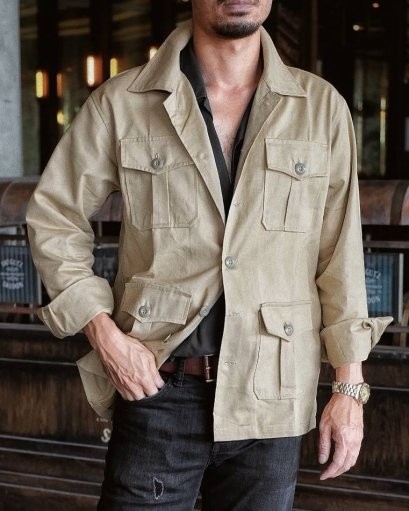 คริสต์ศตวรรษที่ 19 ทหารอังกฤษสมัยครามโลกที่ต้องไปประจำการ ที่แอฟริกาใต้ ด้วยสภาพอากาศที่ร้อนและแห้งแล้ง กองทัพจึงตัดชุดที่เข้ากับภูมิอากาศและสภาพแวดล้อมสีน้ำตาล เป็นจุดเริ่มต้นของชุด SAFARI สีกากี หรือสีน้ำตาลอ่อน ที่ใช้เนื้อผ้า cotton หรือผ้าฝ้ายที่เนื้อไม่หนา สวมใส่สบายในเขตอากาศร้อน มีกระเป๋า 4 ตำแหน่งบริเวณหน้าเสื้อเป็นเอกลักษณ์ที่โด่ดเด่นมาก และในเวลาต่อมา ชาวยุโรปที่นิยมไปล่าสัตว์ที่ทวีปแอฟริกานำมาสวมใส่ จึงทำให้เป็นที่นิยมอย่างมาก