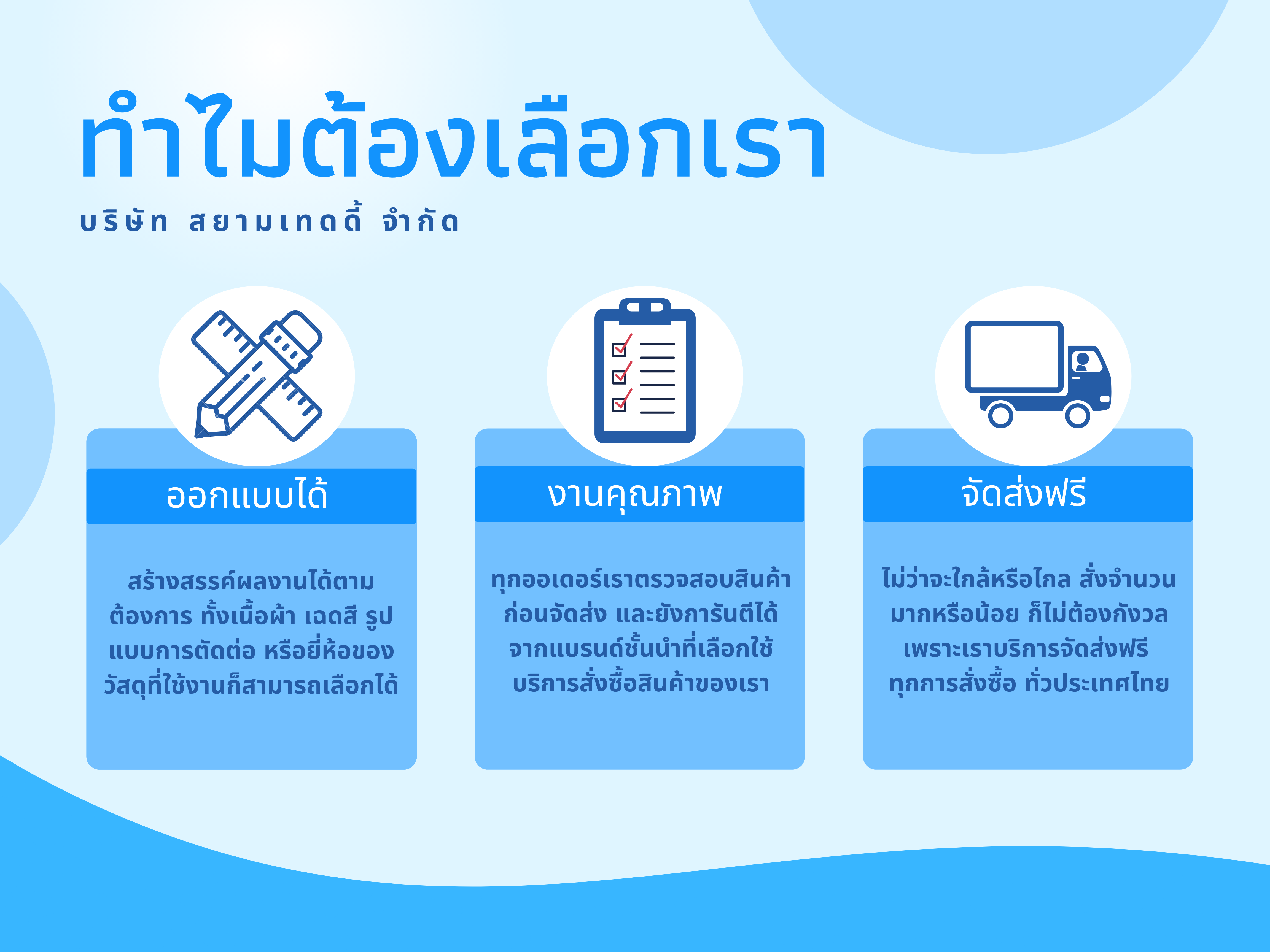 ผู้จำหน่ายและรับผลิตเสื้อผ้าสำเร็จรูปรวมถึงงานตัดเย็บทุกรูปแบบ ด้วยประสบการณ์การทำงานด้านเสื้อผ้ากว่า 30 ปี จึงทำให้ลูกค้าไว้วางใจเลือกใช้บริการของเราอย่างต่อเนื่อง ทั้งเสื้อแจ็คเก็ต เสื้อช็อป ชุดช่าง โปโล คอกลม เสื้อกั๊ก เสื้อเซฟตี้ เสื้อจราจร กระเป๋ากล่อง กระเป๋าส่งอาหาร ถุงผ้า ผ้ากันเปื้อน และอื่น ๆ อีกมากมาย สามารถสั่งผลิตตามแบบที่ต้องการ พร้อมโลโก้ ปักหรือสกรีน