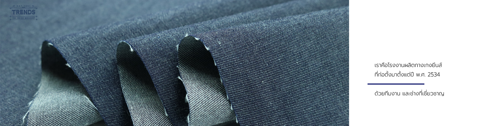 ที่เทรนด์ส ยีนส์ (TRENDS JEANS) เราคือโรงงานผลิตกางเกงยีนส์ที่ก่อตั้งมาตั้งแต่ปี พ.ศ. 2534 ซึ่งเราได้สั่งสมประสบการณ์การรับผลิตกางเกงยีนส์มายาวนานกว่า 30 ปี ด้วยทีมงาน และช่างที่เชี่ยวชาญ เราเริ่มมาจากความหลงไหล และความรักในเรื่องของยีนส์ จึงทำให้เข้าใจถึงทุกรายละเอียด ความโด่นเด่น และความน่าสนใจของผ้ายีนส์แต่ละชนิด ทำให้เราสามารถเลือกวัตถุดิบที่ดีที่สุด มาประยุกต์ และ ผลิตกางเกงยีนส์กางเกงยีนส์ให้ออกมาได้อย่างเหมาะสม และตรงกับความต้องการของลูกค้าที่ต้องการสั่งทํากางเกงยีนส์ขายได้อย่างสูงที่สุด